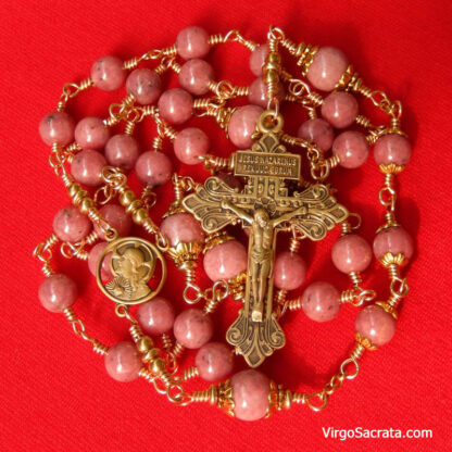 The Chaplet of the Sacred Heart with Pink Rhodonite semiprecious gemstone beads and bronze parts, traditionally wire-wrapped by hand, making the chaplet virtually unbreakable.